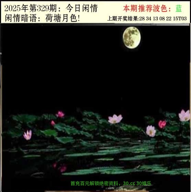 | 329期:今日闲情暗语:【荷塘月色】 解:图中是夜里的月亮,解夜肖鼠牛虎狗猪鸡,解天肖兔马猴猪牛龙 送:牛兔蛇猴马猪 |